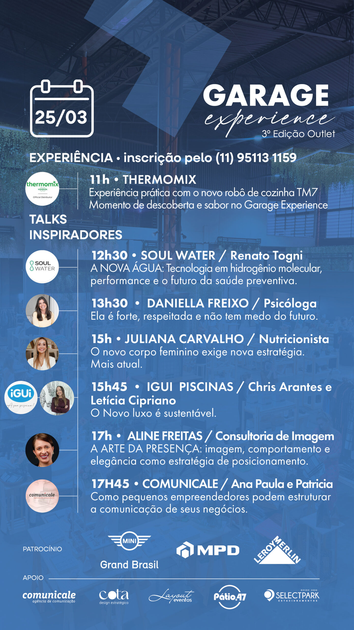 Entre os convidados estão a psicóloga Dani Freixo, que falará sobre os desafios e transformações da mulher contemporânea no talk “Ela é forte, respeitada e não tem medo do futuro”. Já o empresário Renato Togni, da Soul Water, abordará as novas fronteiras da saúde preventiva no encontro “A Nova Água: Tecnologia em Hidrogênio Molecular, Performance e o Futuro da Saúde Preventiva”.