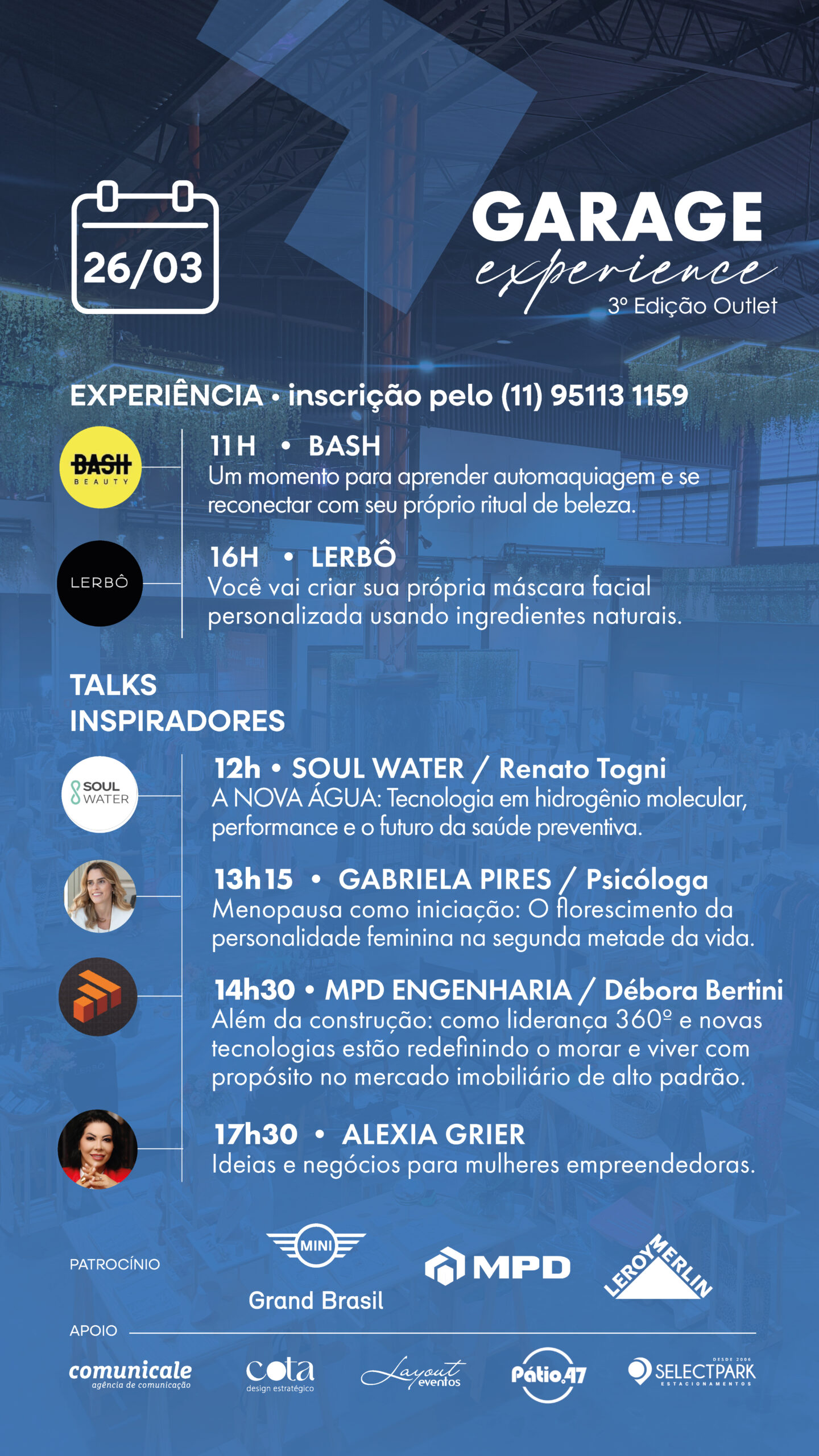 As vagas para as experiências são limitadas e os interessados em participar podem se inscrever pelo WhatsApp do Garage Alphaville: (11) 95113-1159.